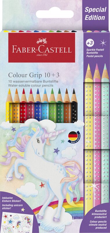 Ξυλομπογιές: Faber Castell Ξυλομπογιές Μεταλλικά Χρώματα 10Τμχ . Εργονομικό τριγωνικό σχήμα. Με ανάγλυφη λαβή grip για σταθερό κράτημα . Απαλή και πλούσια εφαρμογή του χρώματος στο χαρτί. Οι μύτες είναι εξαιρετικά ανθεκτικές στο σπάσιμο, χάρη στην επεξεργασία Sv. Με χώρο για να γράφουν οι μαθητές το όνομά τους επάνω στον κορμό της ξυλομπογιάς. Περιλαμβάνει αυτοκόλλητα μονόκερου.