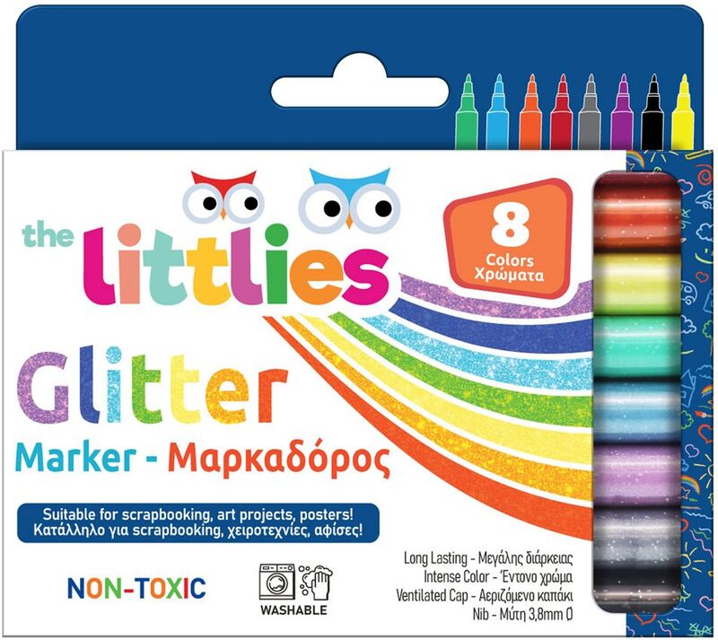 Μαρκαδόροι: The Littlies Μαρκαδόροι Glitter 8Τμχ . Οι Μαρκαδόροι Ζωγραφικής The Littlies με Glitter 8 xρώματα είναι κατάλληλοι για την ανάπτυξη της καλλιτεχνικής έκφρασης και δημιουργικότητας των παιδιών με είδη ζωγραφικής που είναι ασφαλή και πληρούν όλες τις προδιαγραφές. Προσφέρουν ατελείωτες ώρες διασκέδασης και δημιουργικής απασχόλησης με υπέροχες ζωγραφιές και χειροτεχνίες στο σχολείο, το σπίτι και όχι μόνο! Ιδανικοί για scrapbooking, χειροτεχνίες, αφίσες και όχι μόνο! Οι μαρκαδόροι διαθέτουν λεπτή μύτη πάχους 3,8 mm. Υπερ-ανθεκτικοί μαρκαδόροι μεγάλης διάρκειας με αεριζόμενο καπάκι – Η μελάνη των μαρκαδόρων έχει ως βάση το νερό και είναι μη τοξική, ενώ το glitter ξεπλένεται εύκολα από χέρια και ρούχα .