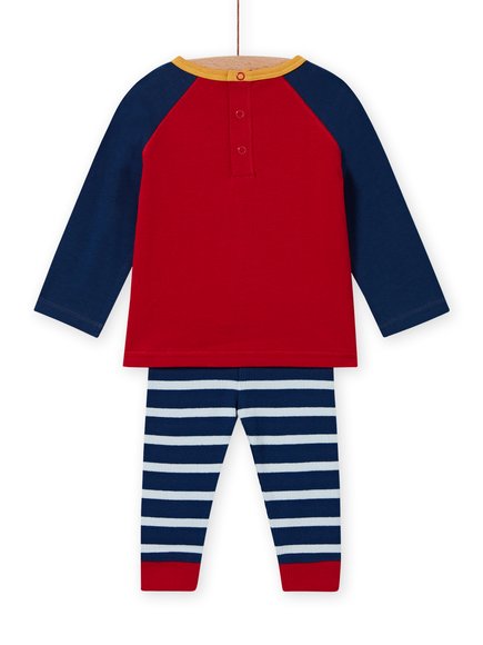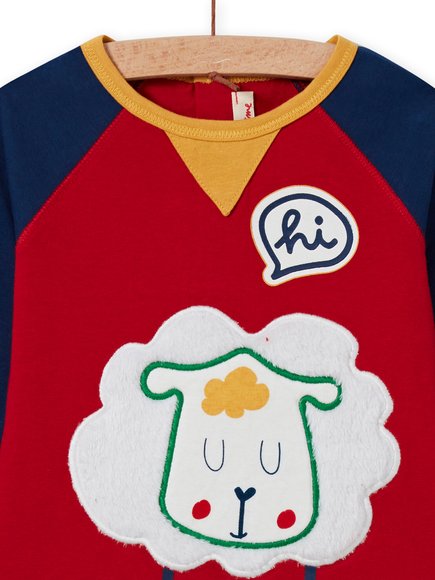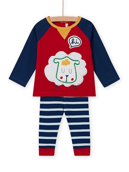 Βρεφικό σετ για αγόρια με μοτίβο πρόβατο και γράμματα. Κουμπιά στην πίσω όψη της μπλούζας. Το παντελόνι είναι ριγέ με ελαστικότητα στη μέση.