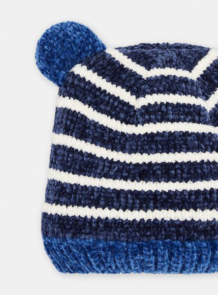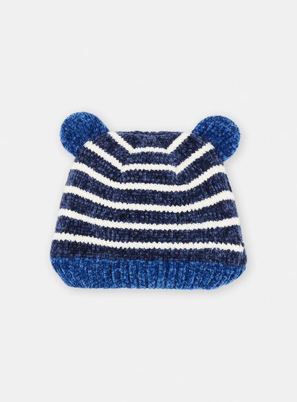 Βρεφικό σκουφάκι για αγόρια σε μπλε χρώμα με ρίγες και λεπτομέρεια από αυτάκια. Μαλακό ύφασμα που κρατάει ζεστό το κεφαλάκι του παιδιού.