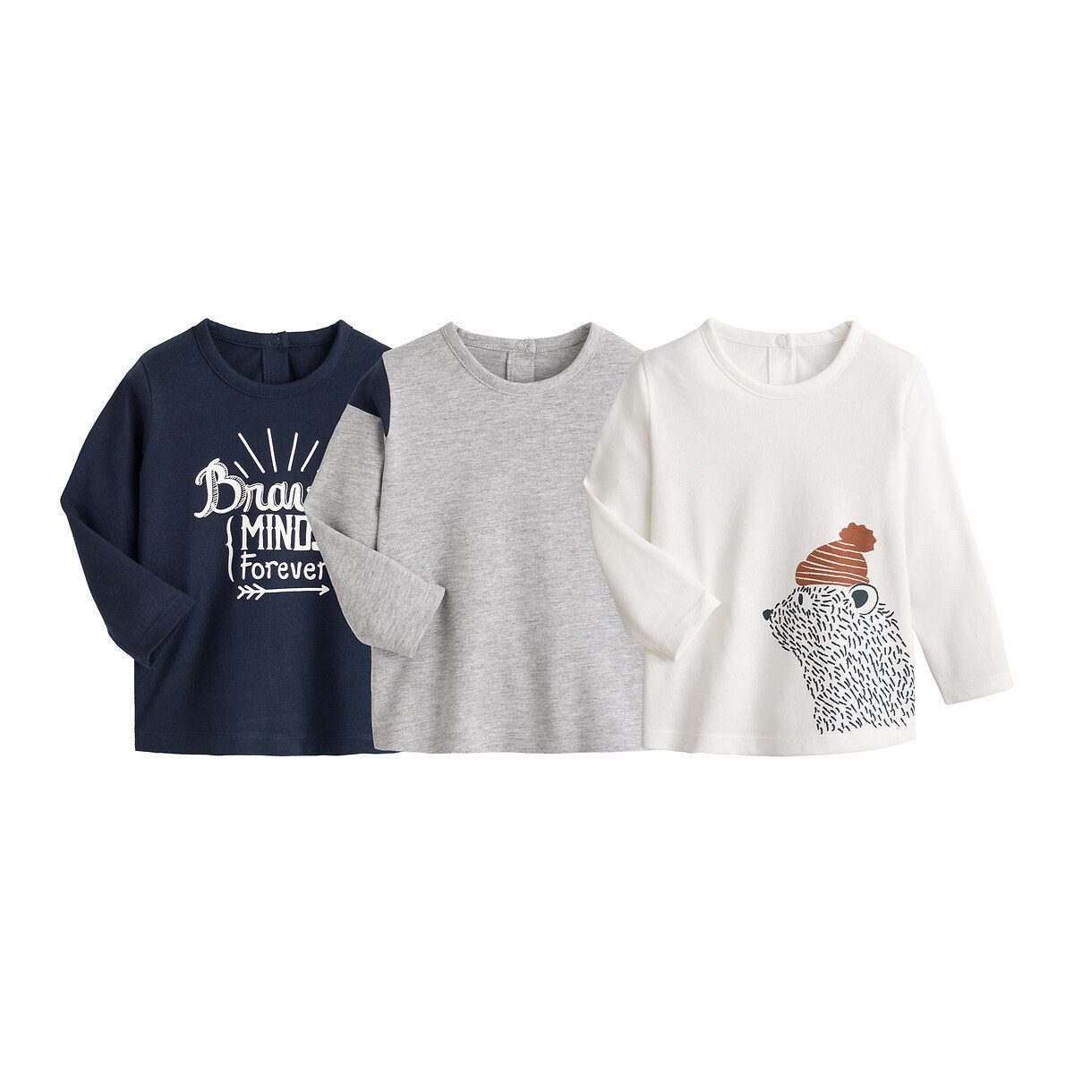 Περιγραφή: – Μακριά μανίκια – Στρογγυλή λαιμόκοψη – Μοτίβο μπροστά – Άνοιγμα με σούστες μέχρι το μέσο της πλάτης για να φοριέται εύκολα – Σετ των 3: 1 μονόχρωμη με μοτίβο στο πλάι + 1 μονόχρωμη + 1 μονόχρωμη με μοτίβο μπροστάΣύνθεση και συντήρηση: – 100% βαμβάκι – Πλύσιμο στο πλυντήριο στους 40°C – Σιδέρωμα σε μέτρια θερμοκρασία – Στεγνωτήριο σε χαμηλή ταχύτητα – Απαγορεύεται το στεγνό καθάρισμαΠροϊόν υπεύθυνης παραγωγής – Βαμβάκι βιολογικής γεωργίας: υπεύθυνη επιλογή και κατανάλωση. Γιατί; Επειδή για την παραγωγή του δεν χρησιμοποιούνται χημικά προϊόντα, φυτοφάρμακα, εντομοκτόνα και γενετικά τροποποιημένοι οργανισμοί. Αποτέλεσμα: μικρότερος αντίκτυπος στη βιοποικιλότητα και την υγεία των καλλιεργητών.  – Επιλέξτε ένα προϊόν με την ετικέτα «STANDARD 100 by OEKO-TEX® n° CQ1102/4 IFTH regroupant CQ1102/5 IFTH et n° CQ1102/6 IFTH», σίγουρα μια πολύ τεχνική περιγραφή που μπορεί να μην καταλαβαίνετε, αλλά σημαίνει ότι επιλέγετε ένα ύφασμα αβλαβές, που δεν ερεθίζει το δέρμα. Μια ανεξάρτητη και διεθνής πιστοποίηση αναφοράς που προστατεύει την υγεία των καταναλωτών. Με γνώμονα την υγεία και την προστασία του περιβάλλοντος.