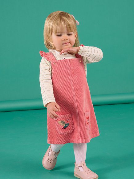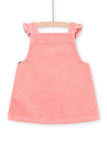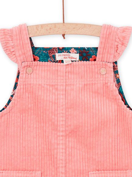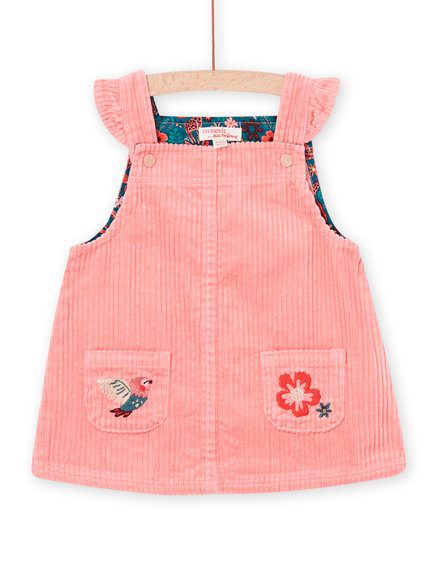 Βρεφικό ροζ φόρεμα για κορίτσια, κοτλέ σχέδιο σε στυλ σαλοπέτας. Έχει βολάν τιράντες και τσέπες με μοτίβο πουλιών και λουλουδιών.