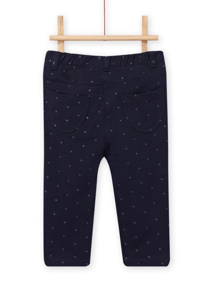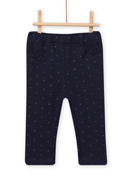 Βρεφικό μακό παντελόνι για κορίτσια σε μπλε χρώμα και διακριτικά πουά στο ίδιο χρώμα με glitter. Διαθέτει δύο τσέπες μπροστά, δύο πίσω και λάστιχο στη μέση. Από την ανοιξιάτικη-καλοκαιρινή συλλογή της Dp…am.
