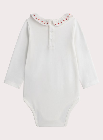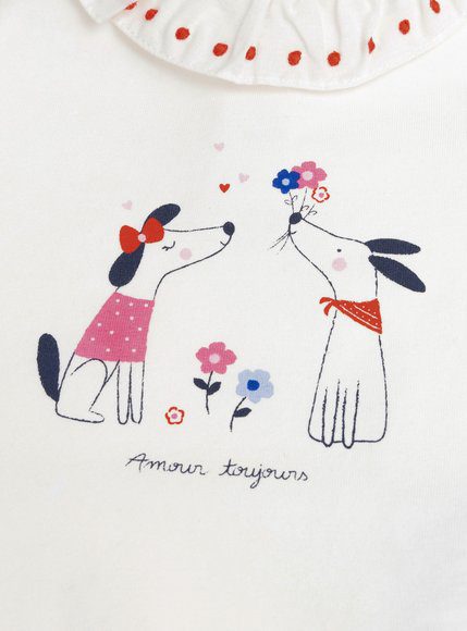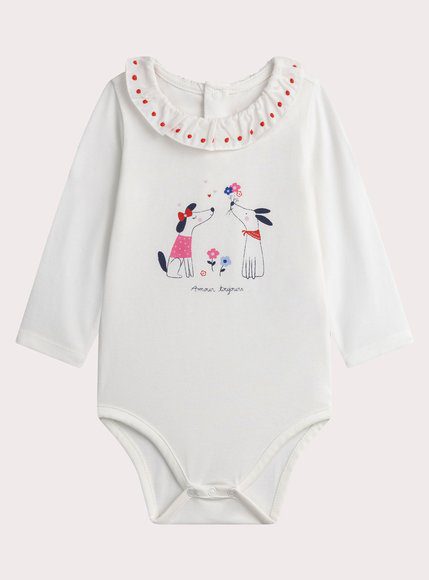 Βρεφικό Ολόσωμο Φορμάκι για Κορίτσια σε λευκό χρώμα με αξιολάτρευτο σχέδιο από σκυλάκια στο μπροστά μέρος. Διαθέτει έναν πολύ ιδιαίτερο γιακά με κόκκινες λεπτομέρειες. Έχει μεταλλικά κουμπάκια στο πίσω και στο κάτω μέρος για εύκολο βάλε βγάλε. Πάντα με την μοναδική ποιότητα της Dp…am!