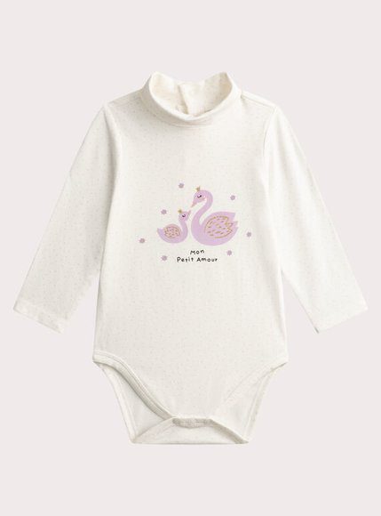 Βρεφικό Ολόσωμο Φορμάκι για Κορίτσια σε λευκό και απαλό λιλά χρώμα, στυλ πουά. Είναι φτιαγμένο από βαμβακερό ζέρσεϊ και προσφέρει άνεση με τον ψηλό λαιμό και τα μακριά μανίκια του. Το άνοιγμα του κουμπιού στο πίσω μέρος διευκολύνει το ντύσιμο, ενώ το σχέδιο με τους κύκνους προσθέτει μια αξιολάτρευτη πινελιά. Πάντα με την μοναδική ποιότητα της Dp…am!