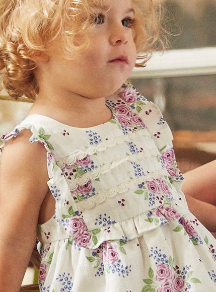 Βρεφικό Αμάνικο Φόρεμα σε λευκό χρώμα με σχεδιάκια από ροζ λουλουδάκια και μπλέ και πράσινες λεπτομέρειες. Διαθέτει βολανάκια στους ώμους αλλα και στο μπροστά μέρος.