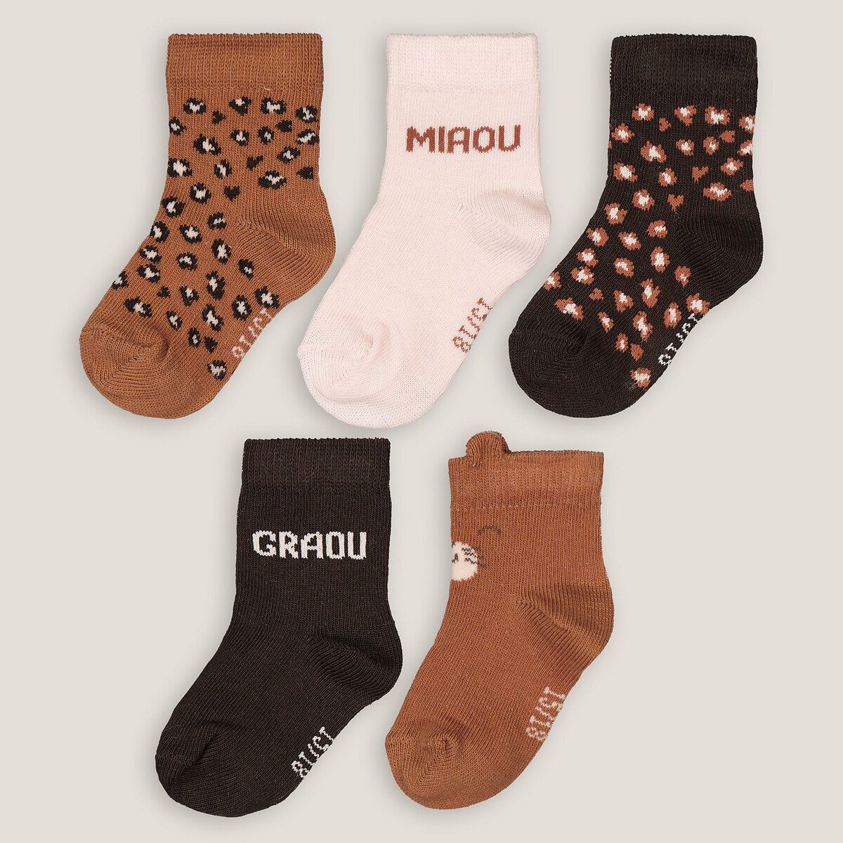 Περιγραφή – Σετ 5 ζευγάρια καλτσάκια με λεοπάρ σχέδιαΣύνθεση και συντήρηση – 77% βαμβάκι, 21% πολυαμίδη, 2% ελαστάνη – Πλύσιμο στο πλυντήριο στους 30°C – Απαγορεύεται το σιδέρωμα – Απαγορεύεται το στεγνωτήριο – Απαγορεύεται το στεγνό καθάρισμα