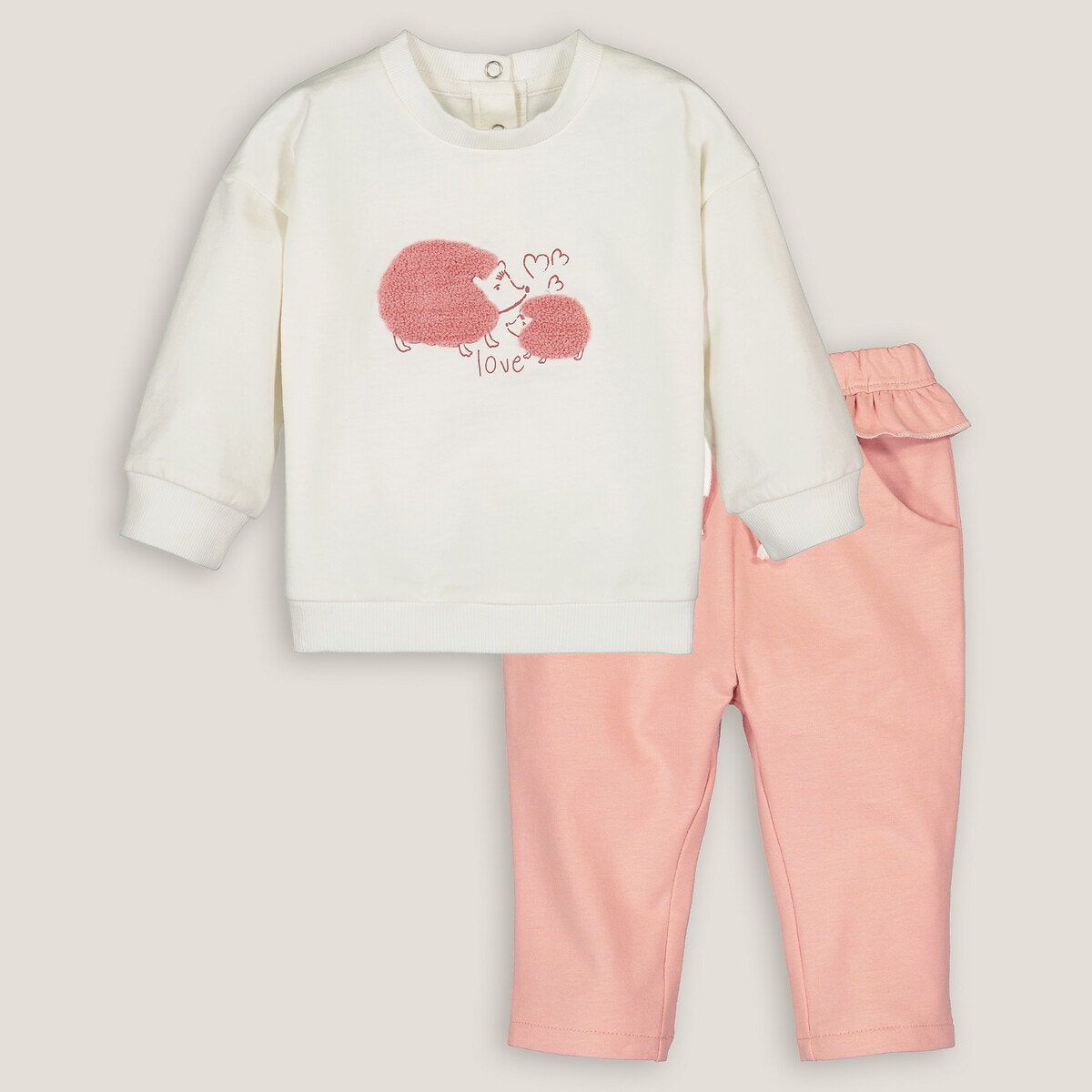 Σύνολο από μαλακή και ζεστή φανέλα με φούτερ και μονόχρωμο παντελόνι jogpant με βολάν.Περιγραφή – Κανονική μέση – Φούτερ με στρογγυλή λαιμόκοψη – Μακριά μανίκια – Χαμηλή μανικοκόλληση – Μπουκλέ μοτίβο "σκαντζόχοιροι" μπροστά – Σούστες μέχρι το μέσο της πλάτης και μέχρι το μέγεθος των 3 ετών για να φοριέται εύκολα – Μονόχρωμο παντελόνι jogpant – Ρυθμιζόμενη μέση με λάστιχο και κορδόνι που σφίγγει και βολάν – 2 τσέπες μπροστάΣύνθεση και συντήρηση: – 95% βαμβάκι, 5% ελαστάνη – Πλύσιμο στο πλυντήριο στους 40°C – Σιδέρωμα σε χαμηλή θερμοκρασία – Στεγνωτήριο σε χαμηλή ταχύτητα – Απαγορεύεται το στεγνό καθάρισμαΠροϊόν υπεύθυνης παραγωγής – Επιλέγοντας ένα προϊόν με την ετικέτα "STANDARD 100 by OEKO-TEX®" (σίγουρα μια πολύ τεχνική περιγραφή που μπορεί να μην καταλαβαίνετε), επιλέγετε ένα ύφασμα αβλαβές, που δεν ερεθίζει το δέρμα. Μια ανεξάρτητη και διεθνής πιστοποίηση αναφοράς που προστατεύει την υγεία των καταναλωτών. Με γνώμονα την υγεία και την προστασία του περιβάλλοντος.