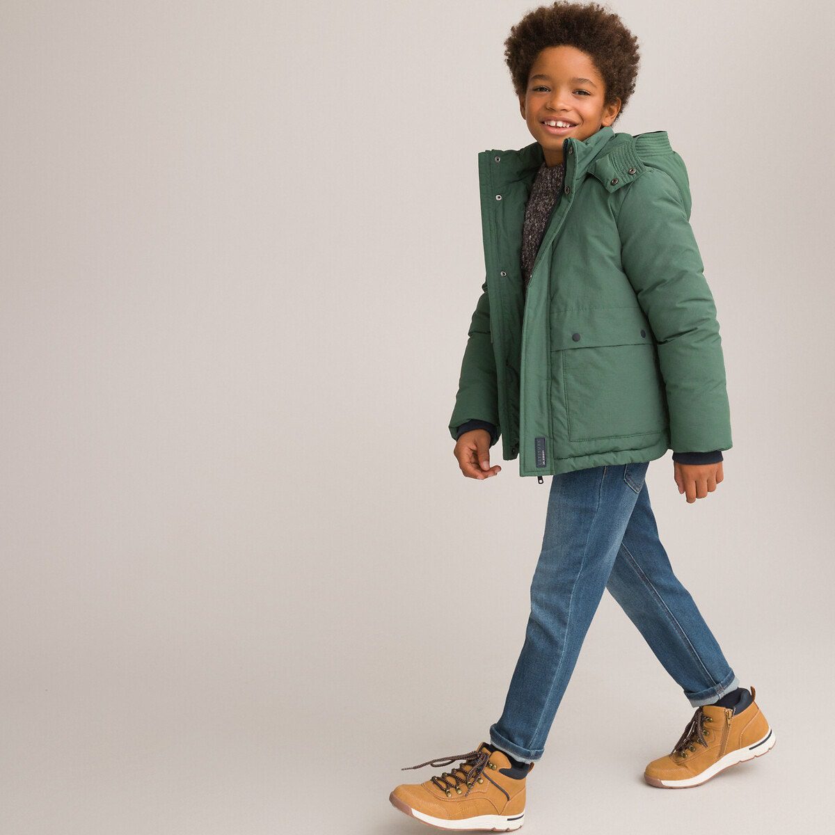 Για να είναι προστατευμένα τα αγοράκια μας από τη βροχή και το κρύο, επιλέξτε αυτό το αδιάβροχο μπουφάν με κουκούλα και φλις επένδυση. Ιδανικό για το χειμώνα.Περιγραφή – Για το χειμώνα – Αδιάβροχο – Φλις επένδυση μπροστά, πίσω και στην κουκούλα – Κλείνει με φερμουάρ κάτω από πατιλέτα με σούστες – Μη αφαιρούμενη κουκούλα με σούστες – 2 τσέπες με σούστα στα πλάγια – 1 τσέπη στο εσωτερικό με ραμμένη ετικέτα για να γράψετε το όνομα του παιδιού – Μανσέτες που σφίγγουν με ριμπ τελείωμα – Κοντό μήκοςΣύνθεση και συντήρηση: – Κύριο υλικό: 52% βαμβάκι, 48% πολυαμίδη – Φόδρα: 100% πολυέστερ – Φόδρα στα μανίκια: 100% πολυέστερ – Γέμισμα: 100% πολυέστερ – Πλύσιμο στους 30°C στο πρόγραμμα για ευαίσθητα – Σιδέρωμα σε χαμηλή θερμοκρασία – Απαγορεύεται το στεγνωτήριο – Απαγορεύεται το στεγνό καθάρισμαΠροϊόν υπεύθυνης παραγωγής – Επιλέγοντας ένα προϊόν με την ετικέτα "STANDARD 100 by OEKO-TEX®" (σίγουρα μια πολύ τεχνική περιγραφή που μπορεί να μην καταλαβαίνετε), επιλέγετε ένα ύφασμα αβλαβές, που δεν ερεθίζει το δέρμα. Μια ανεξάρτητη και διεθνής πιστοποίηση αναφοράς που προστατεύει την υγεία των καταναλωτών. Με γνώμονα την υγεία και την προστασία του περιβάλλοντος.