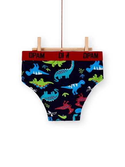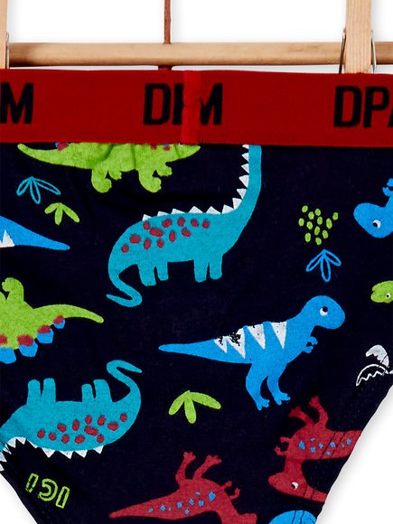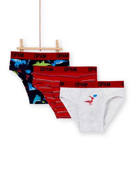 Παιδικά σλιπάκια για αγόρια. Το σετ περιέχει 3 σλιπάκια με λάστιχο στη μέση. Το ένα είναι μπλε με πολύχρωμα δεινοσαυράκια, το δεύτερο είναι κόκκινο με ρίγες και το τρίτο είναι λευκό με ένα δεινοσαυράκι μπροστά. Από τη φθινοπωρινή/χειμερινή συλλογή της DPAM!