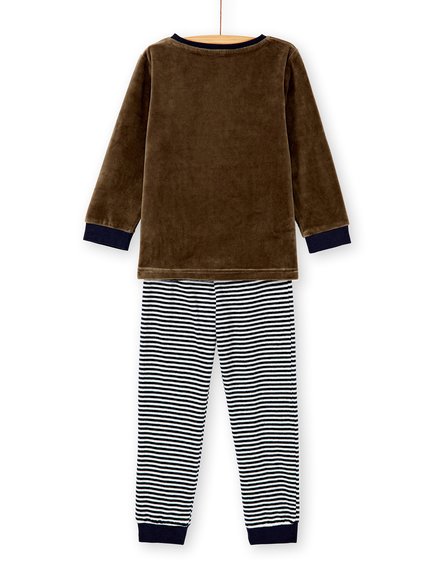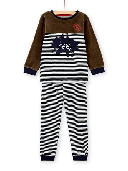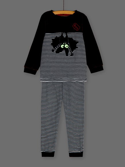 Φανταστική πιτζάμα γαι αγόρια που δε φοβούνται τις νυχτερίδες αλλά αγαπούν ό,τι φωσφορίζει. 2 κομμάτια, το παντελόνι με μπλε οριζόντιες ρίγες και η μπλούζα βελουτέ καφέ με ρίγες και “boo” που φωσφορίζει στο σκοτάδι! Η συλλογή AW20 της DPAM θα ενθουσιάσει μικρούς και μεγάλους!