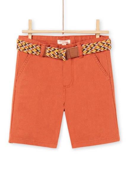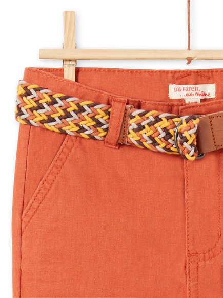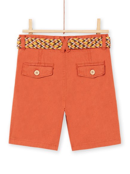 Ροδακινί παιδική βερμούδα για αγόρια. Έχει άνοιγμα με φερμουάρ στο μπροστινό μέρος, 4 τσέπες, 2 σε κάθε πλευρά και συνδυάζει πλεκτή πολύχρωμη ζώνη.