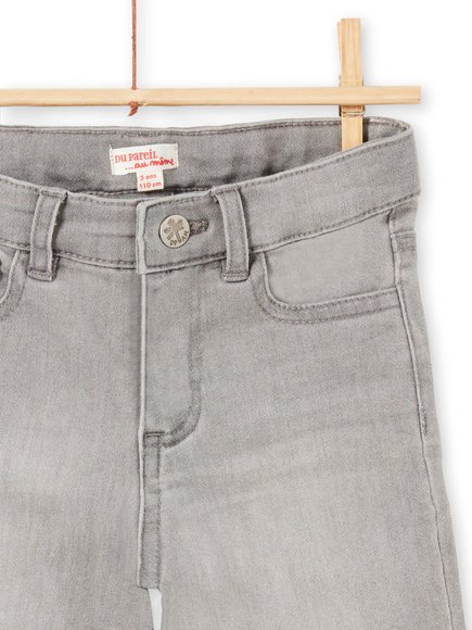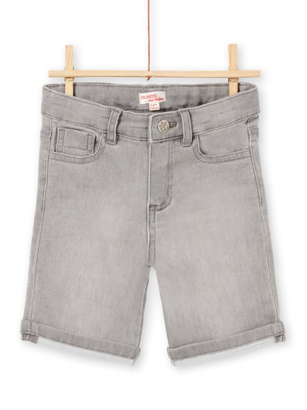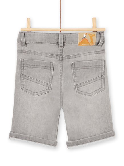 Γκρι τζιν παιδική βερμούδα για αγόρια. Άνοιγμα με φερμουάρ και κουμπί με σχέδιο φοίνικα και DPAM. Συνολικά έχει 5 τσέπες, 3 στο μπροστινό και 2 στο πίσω μέρος. Μπορείτε να το συνδυάσετε και με ζώνη, στο πίσω μέρος υπάρχει σχέδιο με τροπικό πουλί τουκάν πάνω σε καμήλα και γράμματα Du pareil au meme.