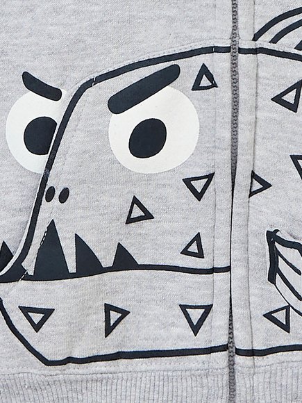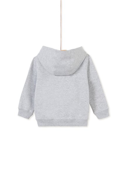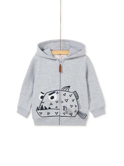 Παιδική ζακέτα με κουκούλα για αγόρια. Σε γκρι χρώμα, με ένα πιράνχας στη μπροστινή πλευρά. Διαθέτει λάστιχο στη μέση και στα μανίκια για να εφαρμόζει καλά. Με 2 τσέπες μπροστά και φερμουάρ. Από τη φθινοπωρινή/χειμερινή συλλογή της DPAM!