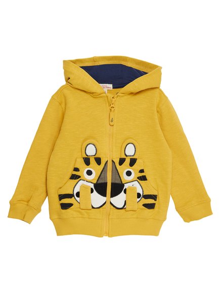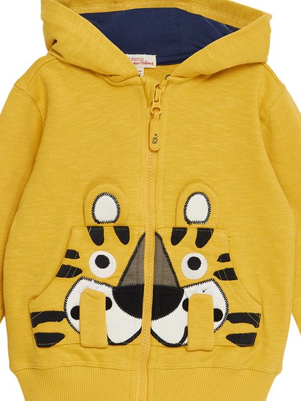 Μια πραγματικά μοναδική παιδική ζακέτα, με κουκούλα και φερμουάρ, για αγόρια. Είναι σε κίτρινο μελάντζ χρώμα, το εσωτερικό της κουκούλας είναι μπλε, ενώ η μπροστινή τσέπη μάρσιππος σχηματίζει ένα γλυκύτατο τιγράκι. Από την ανοιξιάτικη–καλοκαιρινή κολεξιόν της DPAM, Tropical, στην οποία οι γάτες της Σαβάνας και τα τροπικά φυτά είναι οι πρωταγωνιστές. Θα συναντήσετε σε όλα τα προϊόντα της τα floral prints και ζώα της ζούγκλας. Μια συλλογή γεμάτη αγάπη και φιλία. Ένα καλοκαιρινό θέμα με ζεστά χρώματα, όπου το μπλε για κοντράστ δίνει την αίσθηση του ήλιου και των ταξιδιών.