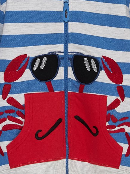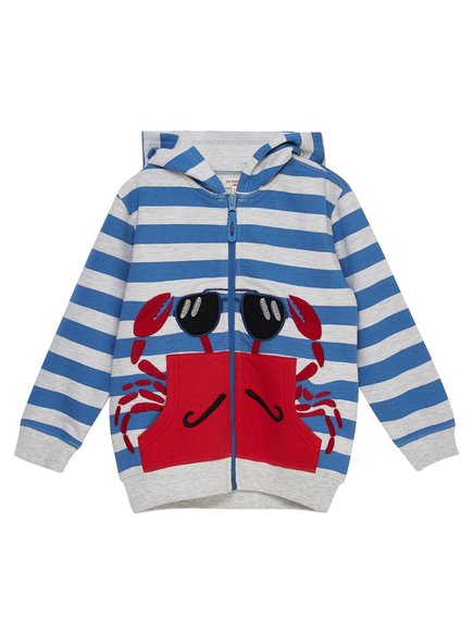 Παιδική ριγέ ζακέτα για αγόρια που αγαπούν τη θάλασσα. Μπλέ με γκρι ρίγες, κλείνει με φερμουάρ και έχει κουκούλα. Και στο σχέδιο ένας πολύ cool κάβουρας με γυαλιά! Η νέα καλοκαιρινή συλλογή SS20 της DPAM θα ξετρελάνει μικρούς και μεγάλους!