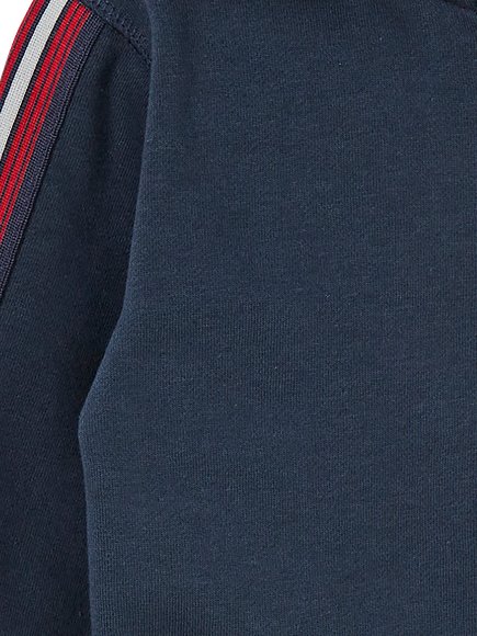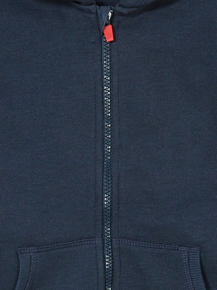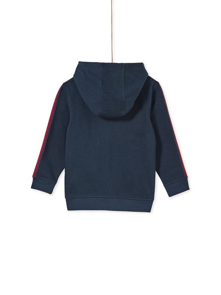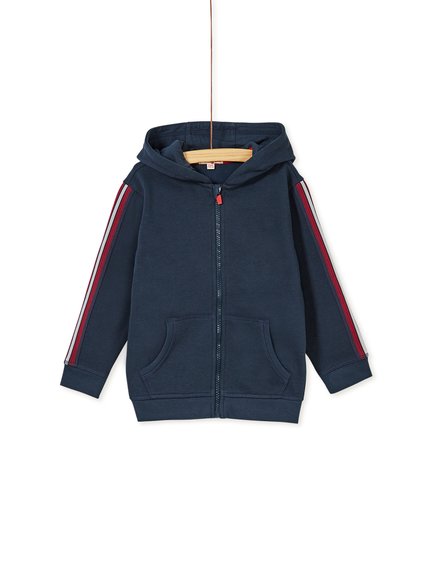 Παιδική ζακέτα με κουκούλα για αγόρια. Σε σκούρο μπλε χρώμα με κόκκινες και λευκές ρίγες στα μανίκια. Διαθέτει λάστιχο στη μέση και στα μανίκια για να εφαρμόζει καλά. Με 2 τσέπες μπροστά και φερμουάρ. Με ελαφριά επένδυση για να προστατεύει από το κρύο. Αναζητήστε το ασορτί παντελόνι φόρμας με τον κωδικό KOJOJOB1. Από τη φθινοπωρινή/χειμερινή συλλογή της DPAM!