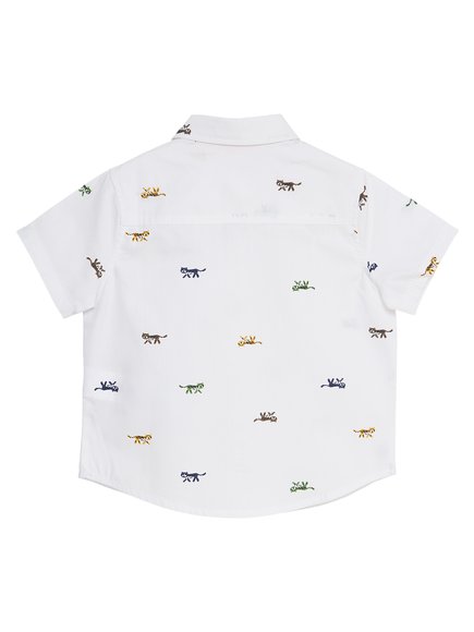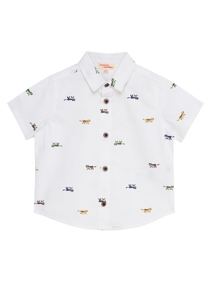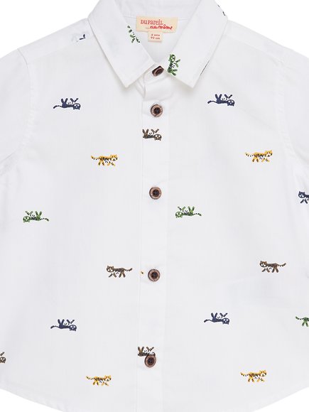Εκρού κοντομάνικο παιδικό πουκάμισο για αγόρια, διακοσμημένο με μικρές χρωματιστές τίγρεις. Από την ανοιξιάτικη–καλοκαιρινή κολεξιόν της DPAM, Tropical, στην οποία οι γάτες της Σαβάνας και τα τροπικά φυτά είναι οι πρωταγωνιστές. Θα συναντήσετε σε όλα τα προϊόντα της τα floral prints και ζώα της ζούγκλας. Μια συλλογή γεμάτη αγάπη και φιλία. Ένα καλοκαιρινό θέμα με ζεστά χρώματα, όπου το μπλε για κοντράστ δίνει την αίσθηση του ήλιου και των ταξιδιών.