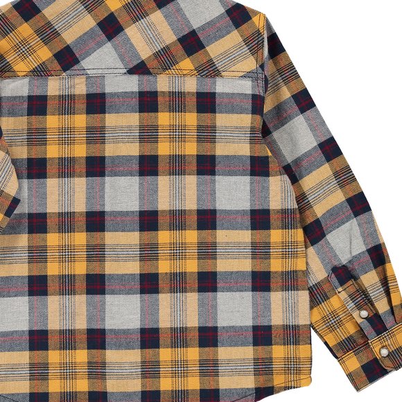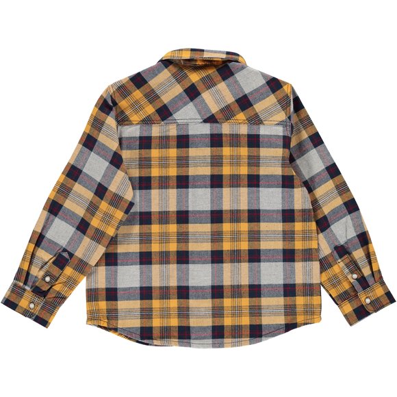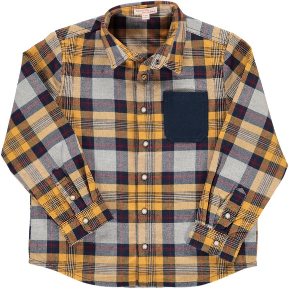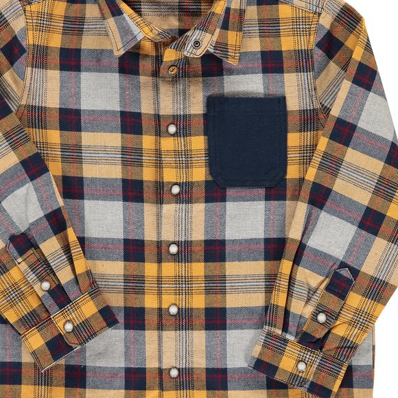 Παιδικό πουκάμισο για αγόρια, σε μοναδικό καρό σε αποχρώσεις του καφέ, του κίτρινου και του κόκκινου. Έχει εσωτερική επένδυση στα ίδια καρό χρώματα, λευκά κουμπιά με το δεύτερο από αυτά να είναι κίτρινο με μαύρο σκυλάκι. Διαθέτει μία μπλε μονόχρωμη τσέπη στα δεξιά. Μοναδικό στιλ, φινέτσα, μα και φροντίδα, DPAM, ακόμη και στις μικρές ηλικίες.