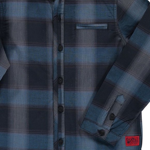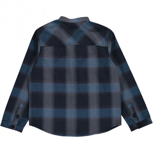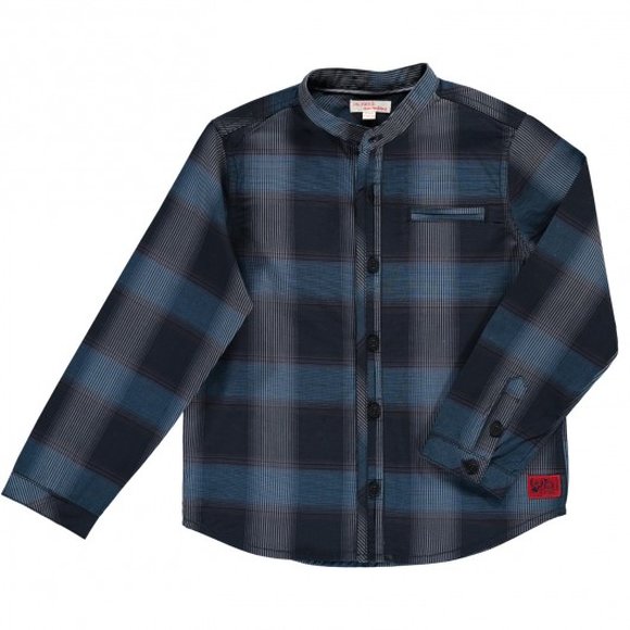 Πολύ μοντέρνο παιδικό καρό πουκάμισο για νεαρούς με άποψη. Σε σκούρες μπλε αποχρώσεις, με λαιμό μανδαρίνου, και κόκκινη λεπτομέρεια κάτω αριστερά