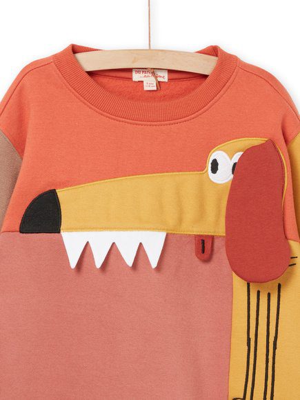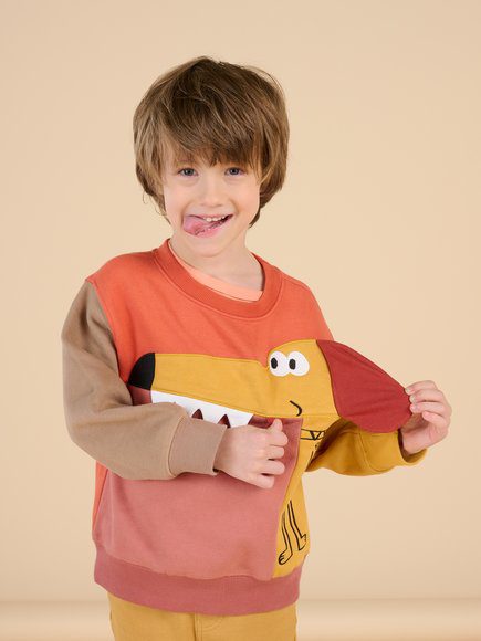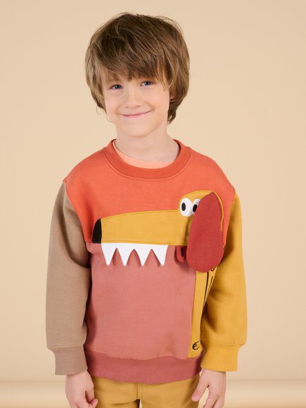 Παιδικό φούτερ για αγόρια σε γήινες αποχρώσεις , καφέ, μουσταρδί, σομόν, πορτοκαλί και σχέδιο σκύλο με ανάγλυφα αυτιά, δόντια και γλώσσα. Πολύ άνετη εφαρμογή και πάντα με τη μοναδική ποιότητα της DPAM!