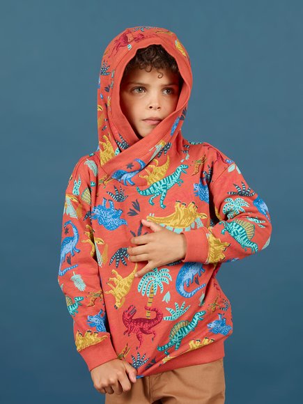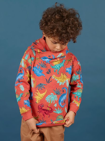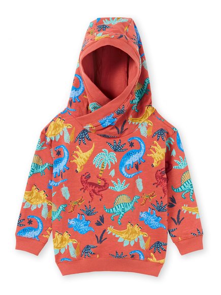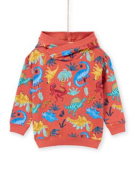 Βρεφικό φούτερ με κουκούλα σε πορτοκάλι χρώμα και μοτίβο με πολύχρωμους δεινόσαυρους.