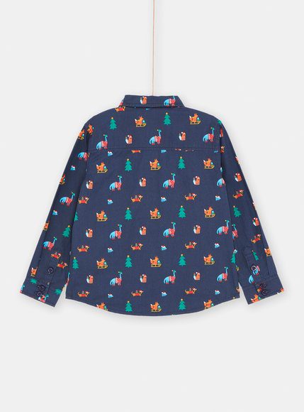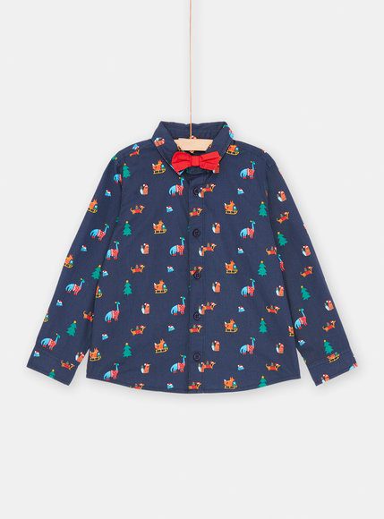 Παιδικό χριστουγεννιάτικο πουκάμισο για αγόρια σε σκούρο μπλε χρώμα, με σχέδια από ζωάκια και δέντρα εμπνευσμένα από το πνεύμα των Χριστουγέννων. Το παπιγιόν δεν συμπεριλαμβάνεται.