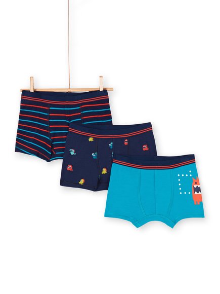 Σετ με 3 εσώρουχα σε μπλε χρώμα. • Ελαστική μέση με ριγέ σχέδιο • Ριγέ σχέδιο, σχέδιο με τερατάκια, και σχέδιο με μεγάλο τερατάκι