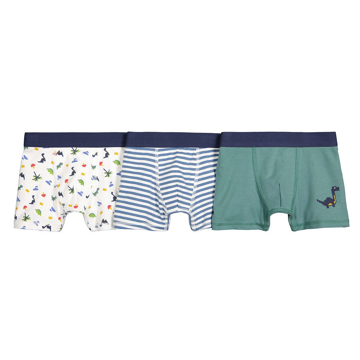 Περιγραφή – Μποξεράκι – Από βαμβάκι – Σετ 3 μποξεράκια (1 εμπριμέ με μοτίβο δεινόσαυρους + 1 ριγέ + 1 μονόχρωμο με στάμπα δεινόσαυρο στο ένα μπατζάκι)Σύνθεση και συντήρηση: – Κύριο υλικό: 95% βαμβάκι, 5% ελαστάνη – Δευτερεύον υλικό: 95% βαμβάκι, 5% ελαστάνη – Πλύσιμο στους 30°C στο πρόγραμμα για ευαίσθητα – Απαγορεύεται το σιδέρωμα – Απαγορεύεται το στεγνωτήριο – Απαγορεύεται το στεγνό καθάρισμα- Ετικέτα OEKO-TEX® Standard 100. Η πιστοποίηση OEKO-TEX® Standard 100 είναι μια ανεξάρτητη και διεθνής πιστοποίηση που εγγυάται την απουσία επιβλαβών ή ερεθιστικών ουσιών για το δέρμα και προστατεύει την υγεία των καταναλωτών.