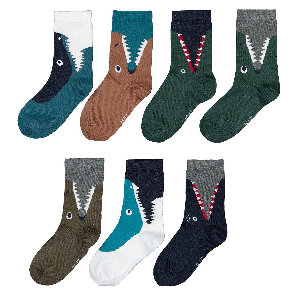 Περιγραφή – Σετ 7 ζευγάρια κάλτσες με μοτίβα κροκόδειλους, καρχαρίες και δεινόσαυρουςΣύνθεση και συντήρηση: – Κύριο υλικό: 72% βαμβάκι, 27% πολυαμίδη, 1% ελαστάνη – Δευτερεύον υλικό 1: 63% βαμβάκι, 35% πολυαμίδη, 2% ελαστάνη – Πλύσιμο στο πλυντήριο στους 30°C – Απαγορεύεται το σιδέρωμα – Στεγνωτήριο σε χαμηλή ταχύτητα – Απαγορεύεται το στεγνό καθάρισμα / η χρήση λευκαντικούΠροϊόν υπεύθυνης παραγωγής – Επιλέγοντας ένα προϊόν με την ετικέτα "STANDARD 100 by OEKO-TEX®" (σίγουρα μια πολύ τεχνική περιγραφή που μπορεί να μην καταλαβαίνετε), επιλέγετε ένα ύφασμα αβλαβές, που δεν ερεθίζει το δέρμα. Μια ανεξάρτητη και διεθνής πιστοποίηση αναφοράς που προστατεύει την υγεία των καταναλωτών. Με γνώμονα την υγεία και την προστασία του περιβάλλοντος.