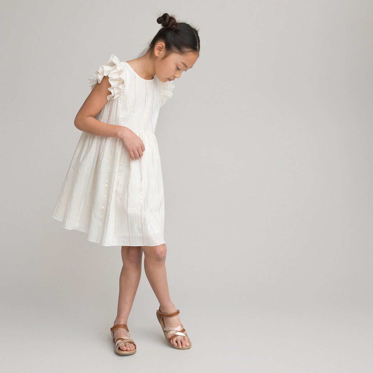 Περιγραφή – Εβαζέ γραμμή – Μήκος μέχρι τα γόνατα – Αμάνικο – Απλικέ βολάν στη μανικοκόλληση – Στρογγυλή λαιμόκοψη – Μοτίβο με ρίγες – Ραφή στο στήθος με σούρες μπροστά και στην πλάτη – Άνοιγμα σταγόνα με κουμπί στην πλάτηΣύνθεση και συντήρηση: – Κύριο υλικό: 92% βαμβάκι, 4% lyocell, 4% μεταλλιζέ ίνες. – Φόδρα: 100% βαμβάκι – Πλύσιμο στους 30°C στο πρόγραμμα για ευαίσθητα – Σιδέρωμα σε χαμηλή θερμοκρασία – Απαγορεύεται το στεγνωτήριο – Απαγορεύεται το στεγνό καθάρισμα – Ετικέτα OEKO-TEX® Standard 100. Η πιστοποίηση OEKO-TEX® Standard 100 είναι μια ανεξάρτητη και διεθνής πιστοποίηση που εγγυάται την απουσία επιβλαβών ή ερεθιστικών ουσιών για το δέρμα και προστατεύει την υγεία των καταναλωτών.