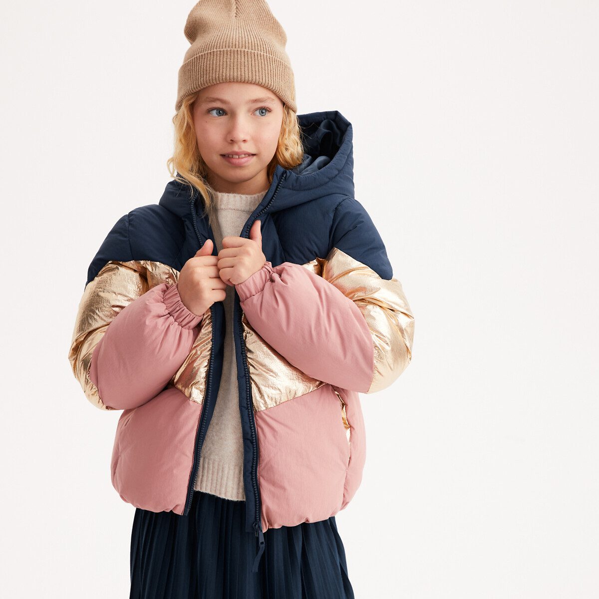 Ζεστό καπιτονέ μπουφάν color block με κουκούλα Μπλε