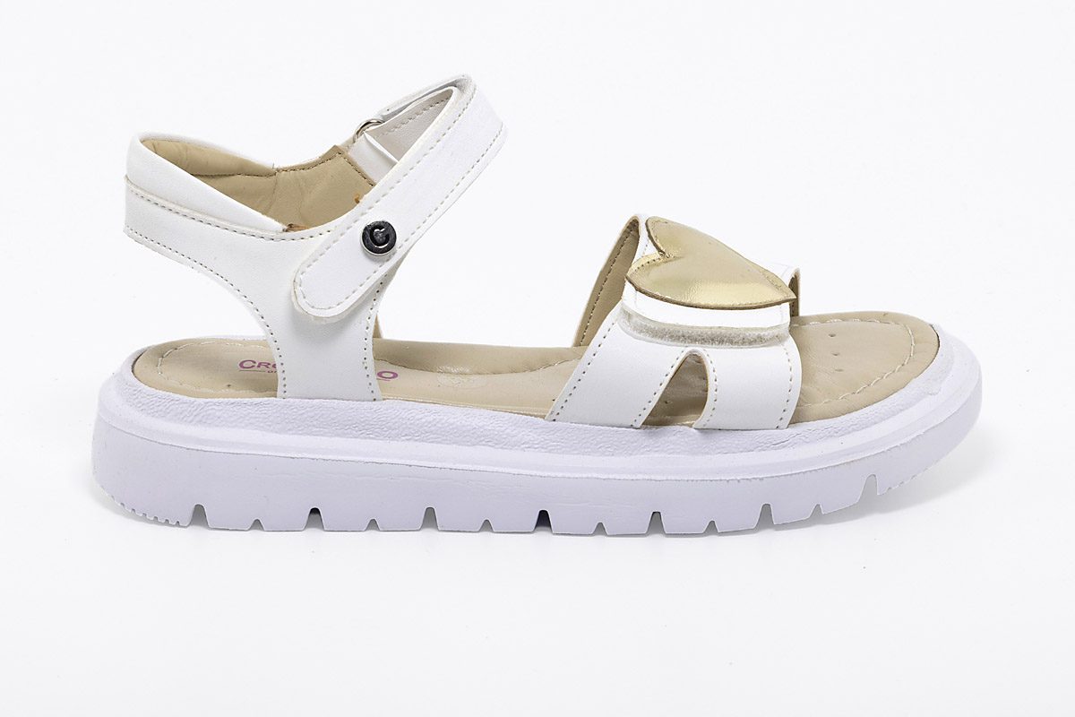 Παιδικά πέδιλα από οικολογικό δέρμα γεμάτα λάμψη για την απόλυτη εμφάνιση του καλοκαιριού! Σε λευκό χρώμα με χρυσή καρδιά που σίγουρα θα εντυπωσιάσουν. Τα 2 αυτοκόλλητα λουράκια velcro το καθιστούν ιδιαίτερα εύκολο στην προσαρμογή σε κάθε πόδι. Η άνετη και μαλακιά σόλα του το καθιστούν εύχρηστο και ευκολοφόρετο όλη την ημέρα καθώς εσωτερικά διαθέτει μαλακό πάτο και φυσικά με την εγγύηση της Crocodilino. Ιδανική επιλογή και για επίσημες εμφανίσεις καθώς συνδυάζεται τέλεια και με φόρεμα σε γάμο ή βάπτιση!