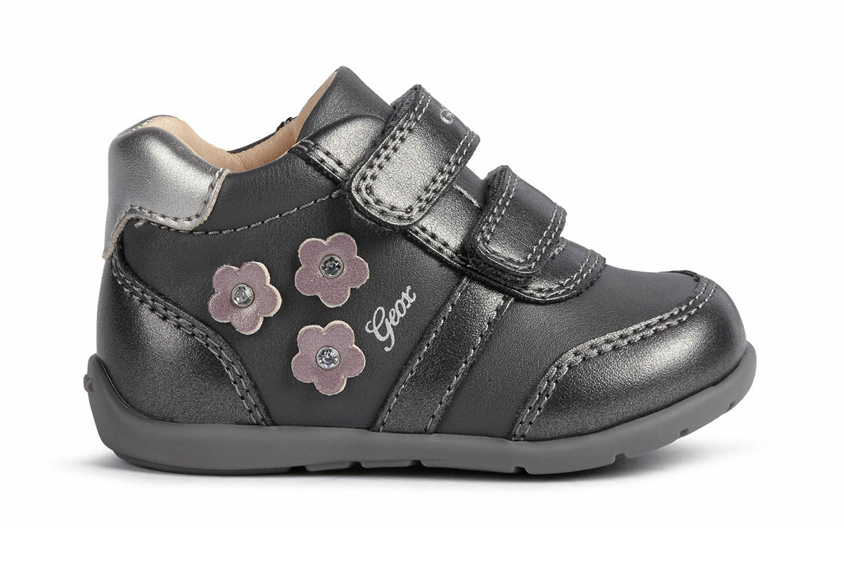 Παιδικά παπούτσια Geox για κορίτσια. Υπέροχο σχέδιο με ροζ λουλουδάκια με στρας σε γκρι μεταλιζέ χρώμα, για εμφανίσεις που θα εντυπωσιάζουν. Με εσωτερικό πατάκι από δέρμα. Σταθερή εφαρμογή χάρη στα δύο ρυθμιζόμενα αυτοκόλλητα λουράκια-velcro. Εύκαμπτη και μαλακή αντιολισθητική σόλα από καουτσούκ, προστατεύει το πέλμα και τα δάχτυλα. Τεχνολογία Respira της Geox που επιτρέπει στο δέρμα να αναπνέει.