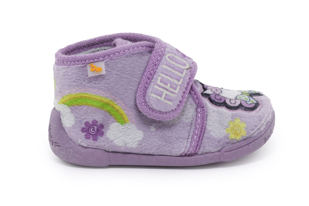 Παιδικές παντόφλες για κορίτσια Vulladi σε λιλά χρώμα με το χαριτωμένο μονόκερο και ένα ουράνιο τόξο. Το αυτοκόλλητο velcro βοηθάει στην εύκολη εφαρμογή και αγκαλιάζει τον αστράγαλο ώστε οι μικροί μας φίλοι να μην θέλουν τα τις αποχωριστούν. Με πέλμα υψηλής πρόσφυσης και στήριξη στο πίσω μέρος της πτέρνας για να κρατάει το ποδαράκι σταθερό, δερμάτινο πατάκι για την υγιεινή του ποδιού και αντιολισθητική σόλα για σταθερά βήματα, το εσωτερικό του έχει ύφασμα για να κρατάει το πόδι στην σωστή θερμοκρασία. Το αυτοκόλλητο βοηθάει να εφαρμόζει σε όλα τα ποδαράκια. Ιδανικές για τα πρώτα βήματα τους μέσα στο σπίτι. Made in Spain