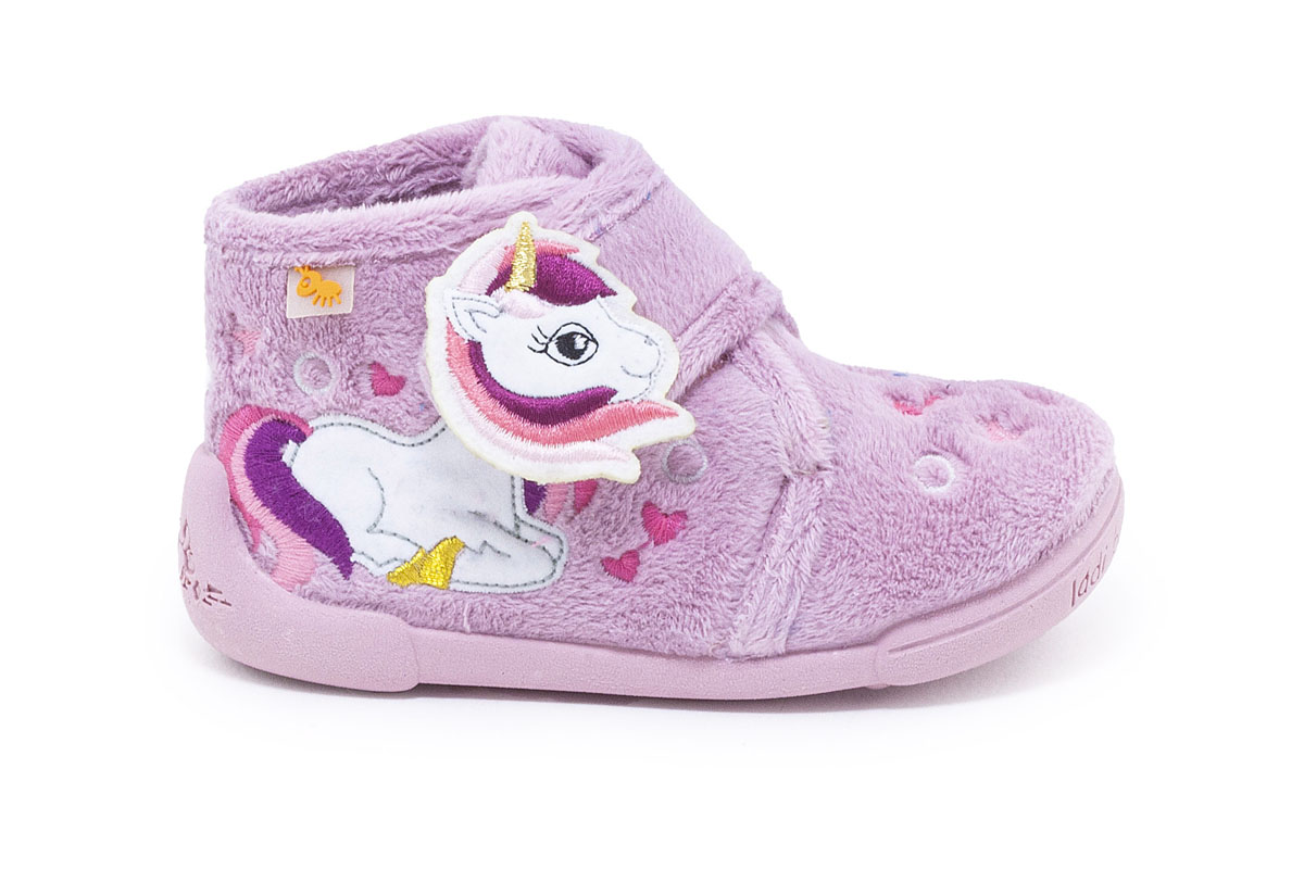 Παιδικά παντοφλάκια για κορίτσι σε ονειρικό ροζ χρώμα με τον αγαπημένο μονόκερο που όλα τα κορίτσια αγαπούν. Το αυτοκόλλητο velcro βοηθάει στην εύκολη εφαρμογή και αγκαλιάζει τον αστράγαλο ώστε οι μικροί μας φίλοι να μην θέλουν τα τις αποχωριστούν. Με πέλμα υψηλής πρόσφυσης και στήριξη στο πίσω μέρος της πτέρνας για να κρατάει το ποδαράκι σταθερό, δερμάτινο πατάκι για την υγιεινή του ποδιού και αντιολισθητική σόλα για σταθερά βήματα, το εσωτερικό του έχει ύφασμα για να κρατάει το πόδι στην σωστή θερμοκρασία. Το αυτοκόλλητο βοηθάει να εφαρμόζει σε όλα τα ποδαράκια. Ιδανικές για τα πρώτα βήματα τους μέσα στο σπίτι. Made in Spain