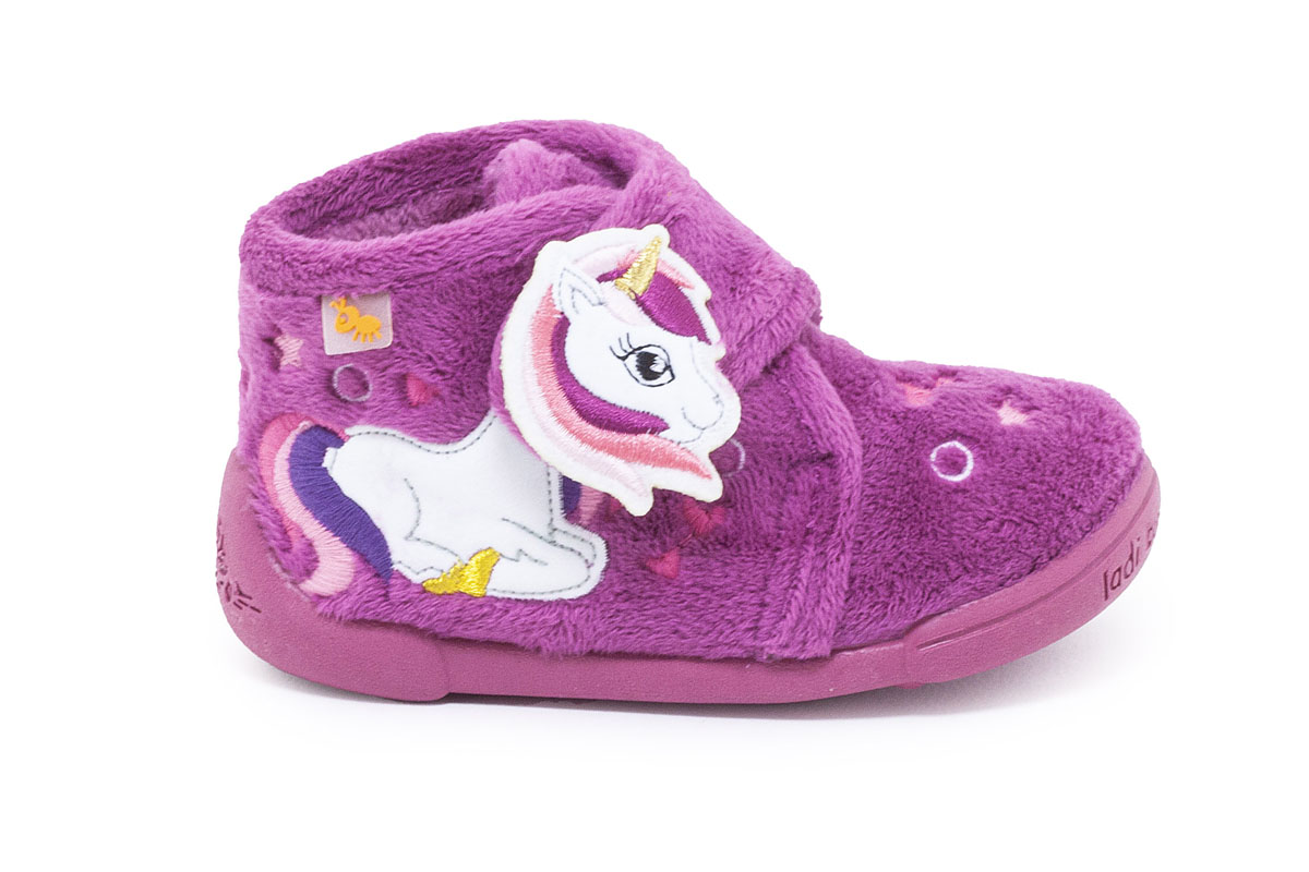 Παιδικά παντοφλάκια Vulladi για κορίτσια σε εντυπωσιακό φούξια χρώμα με τον αγαπημένο μονόκερο που όλα τα κορίτσια αγαπούν. Το αυτοκόλλητο velcro βοηθάει στην εύκολη εφαρμογή και αγκαλιάζει τον αστράγαλο ώστε οι μικροί μας φίλοι να μην θέλουν τα τις αποχωριστούν. Με πέλμα υψηλής πρόσφυσης και στήριξη στο πίσω μέρος της πτέρνας για να κρατάει το ποδαράκι σταθερό, δερμάτινο πατάκι για την υγιεινή του ποδιού και αντιολισθητική σόλα για σταθερά βήματα, το εσωτερικό του έχει ύφασμα για να κρατάει το πόδι στην σωστή θερμοκρασία. Το αυτοκόλλητο βοηθάει να εφαρμόζει σε όλα τα ποδαράκια. Ιδανικές για τα πρώτα βήματα τους μέσα στο σπίτι. Made in Spain