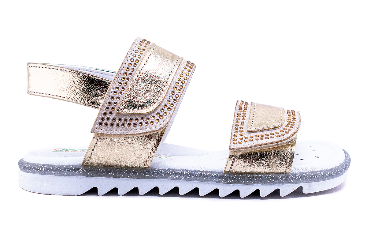 Παιδικά eco leather πέδιλα με μεταλλικά λουράκια και strass. Διαθέτουν velcro για μεγαλύτερη ευκολία και σταθερότητα στην εφαρμογή. Η Crocodilino έχοντας δώσει ιδιαίτερη βάση στον σχεδιασμό και την καλύτερη ποιότητα των παπουτσιών της διαθέτει 100% δερμάτινη απορροφητική επένδυση και ανατομικό δερμάτινο πάτο.Αντιολισθητική σόλα για σταθερό βάδισμα. Εγκεκριμένα από ορθοπεδικό και φυσικά με την εγγύηση της Crocodilino.H σόλα διαφοροποιείται μετά το 37 νούμερο.