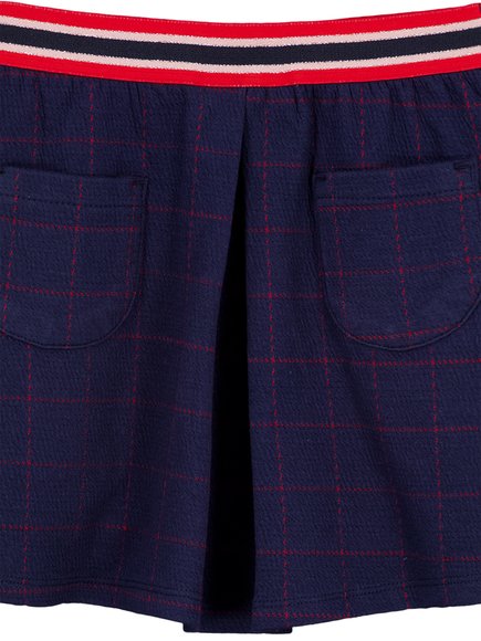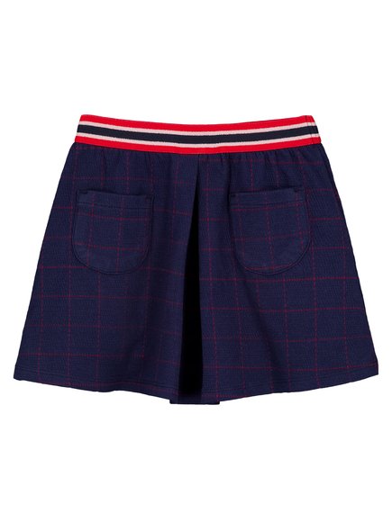 Σούπερ μοντέρνα παιδική φούστα για κορίτσια: Είναι μπλε με διακριτικά κόκκινα καρό, και δυο μπροστινά τσεπάκια, και λάστιχο στην μέση με κόκκινες, λευκές και μπλε ρίγες. Από την Jungle Tricolore φθινοπωρινή και χειμερινή κολεξιόν της DPAM για τις μικρές δεσποινίδες σας, που είναι επηρεασμένη από αγαπημένα χρώματα, πάντα με την ξεχωριστή φαντασία DPAM.