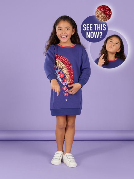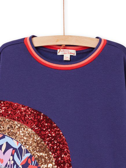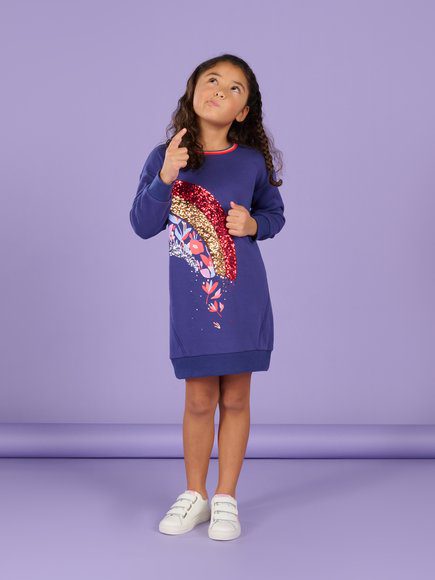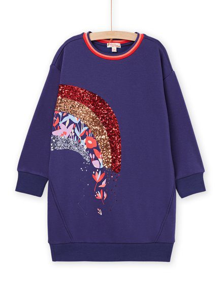 Παιδικό μακρυμάνικο σκούρο μπλε φόρεμα για κορίτσια σε στυλ φούτερ με σχέδιο ουράνιο τόξο με παγιέτες. Πάντα με τη μοναδική ποιότητα της Dpam!