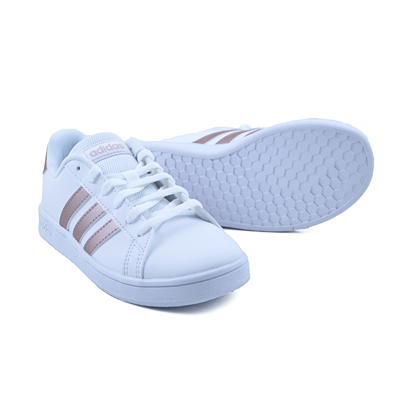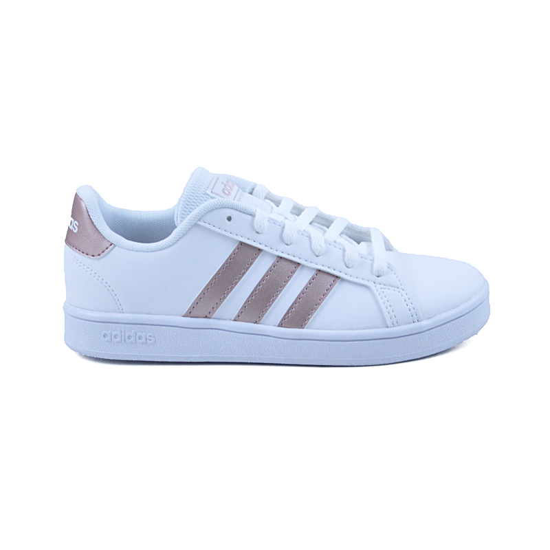 Αποκτήστε το προϊόν Adidas παιδικό αθλητικό παπούτσι για κορίτσια σε λευκό χρώμα με ροζ gold ρίγες στο πλάι.