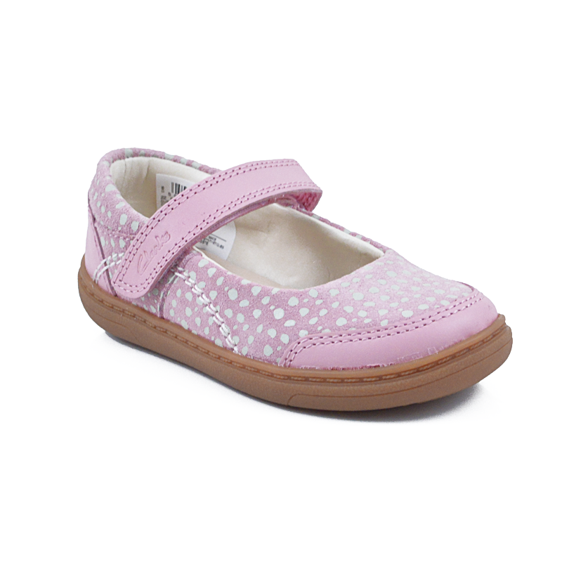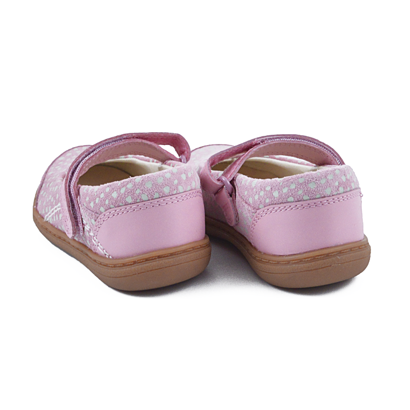 Όμορφο δερμάτινο παπούτσι τύπου μπαλαρίνα που εφαρμόζει σταθερά στο πόδι με αυτοκόλλητο λουράκι. Διαθέτει ροζ χρώμα με πουά λεπτομέρειες και ελαστική σόλα για ξεκούραστο πάτημα. Ιδανικό για συνδυασμό με καλά ρούχα.