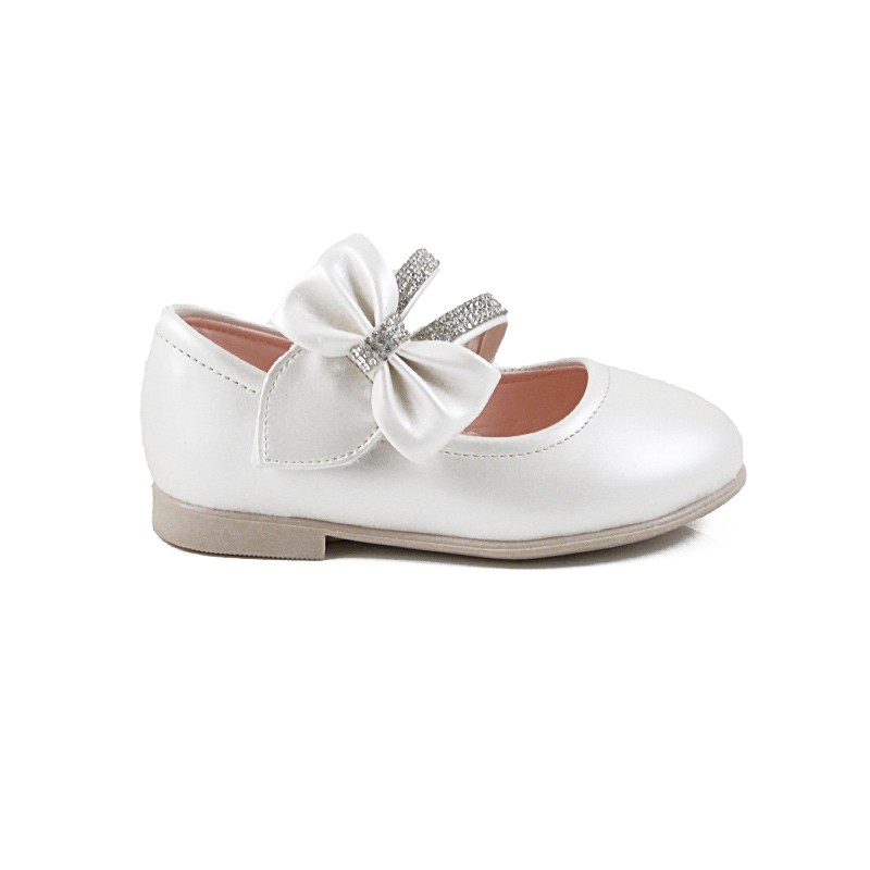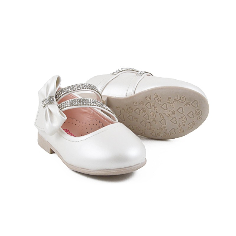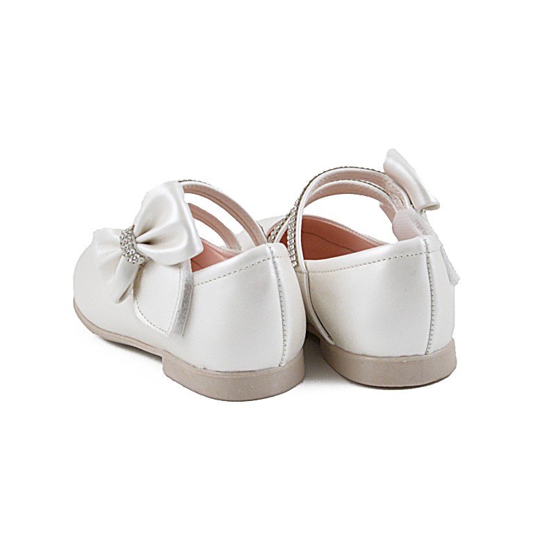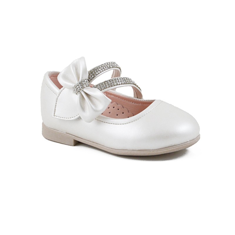Πανέμορφο παπούτσι από ποιοτικό δέρμα με λευκή ιριδίζουσα απόχρωση και διπλό λουράκι με στρας, το οποίο καταλήγει σε έναν κομψό φιόγκο. Διαθέτει μαλακό πάτο και ελαστική σόλα με μικρό τακουνάκι για φινετσάτες εμφανίσεις.